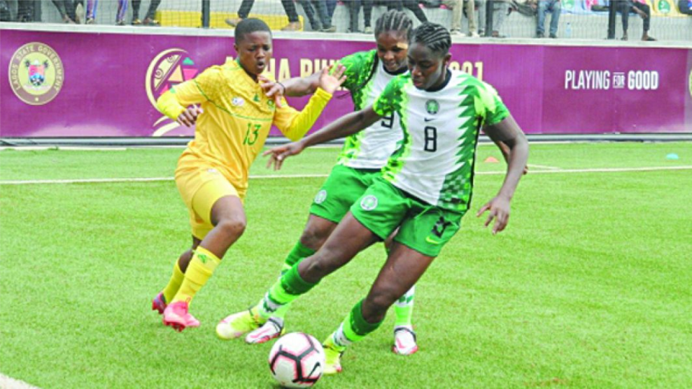Super Falcons’ strikers, Asisat Oshoala and Desire Oparanozie, failed to break down the Banyana Banyana in the final game of the just concluded Aisha Buhari Cup held in Lagos PHOTO: FEMI ADEBESIN-KUTI